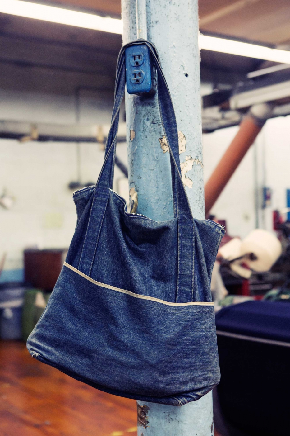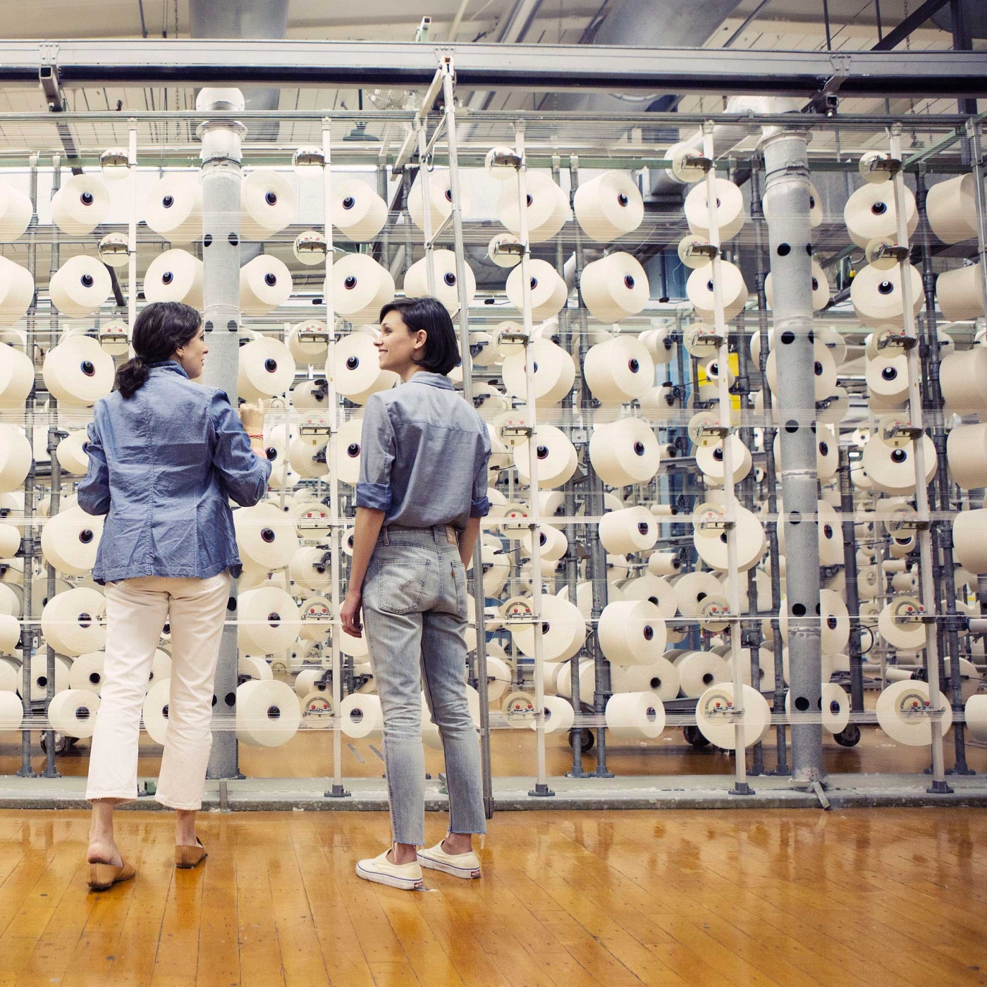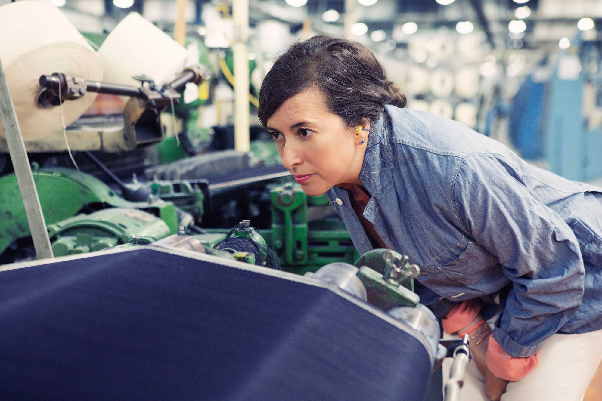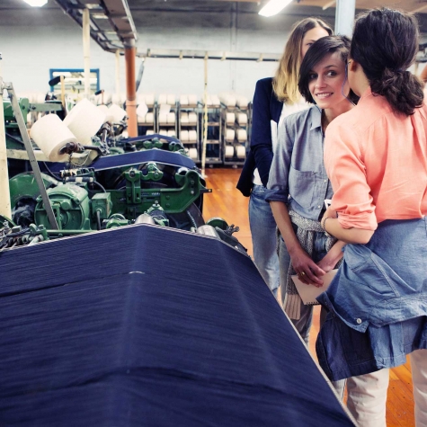 We started talking, and the jeans geeks in us decided that whatever pieces we ended up developing together should be made with Cone Denim©, the U.S.-based heritage company that has been supplying the denim world with beautiful materials since 1891. Clare produces her bags in America (in L.A. to be specific), so it would be a dream pairing. We contacted Cone – they don’t let just anyone use their denim – and they approved us, and said we could visit their White Oak© mill in Greensboro, North Carolina.