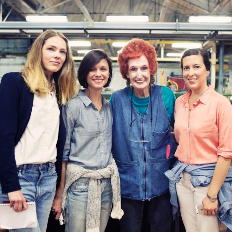 FIELD TRIP! From left, North Carolina-bound, with our own Clare V. catchalls in tow; selfies at the Cone/White Oak mill; Clare and Florence in jackets and jeans.