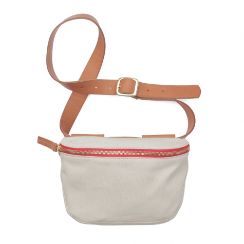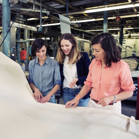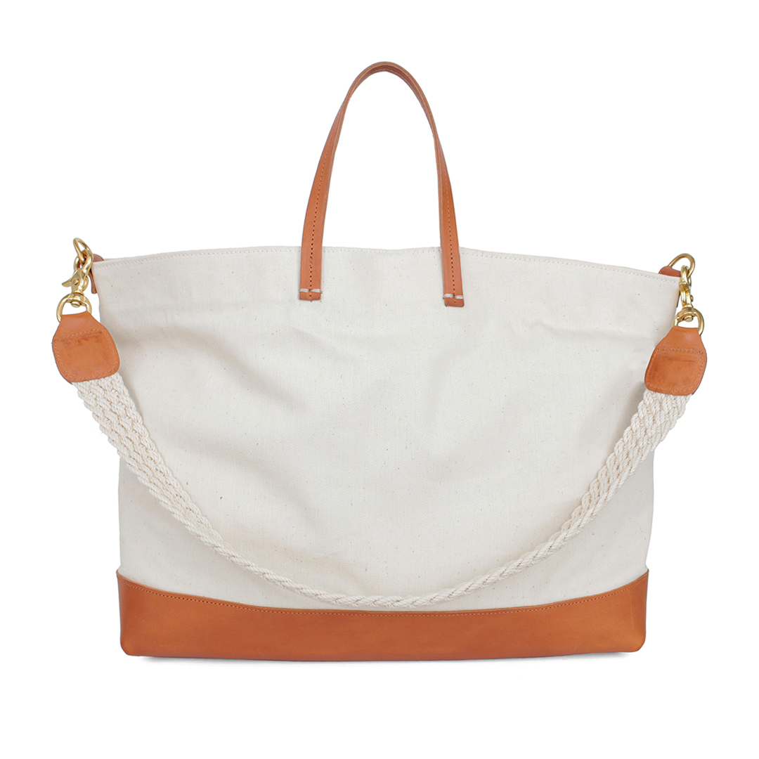 The three of us met at La Guardia on a May day and flew down. We put our ear plugs in and toured the factory, where we saw the most gorgeous selvage being woven on vintage American Draper X3 fly shuttle looms, yarns being spun and indigo dyed, and virgin white cotton fabric (pre-indigo) – the latter of which we instantly knew had to have a place in our collab (see the white tote and fanny pack).