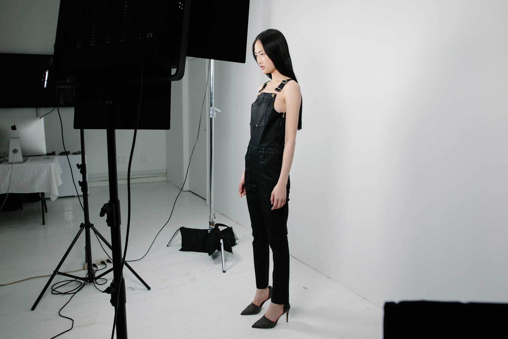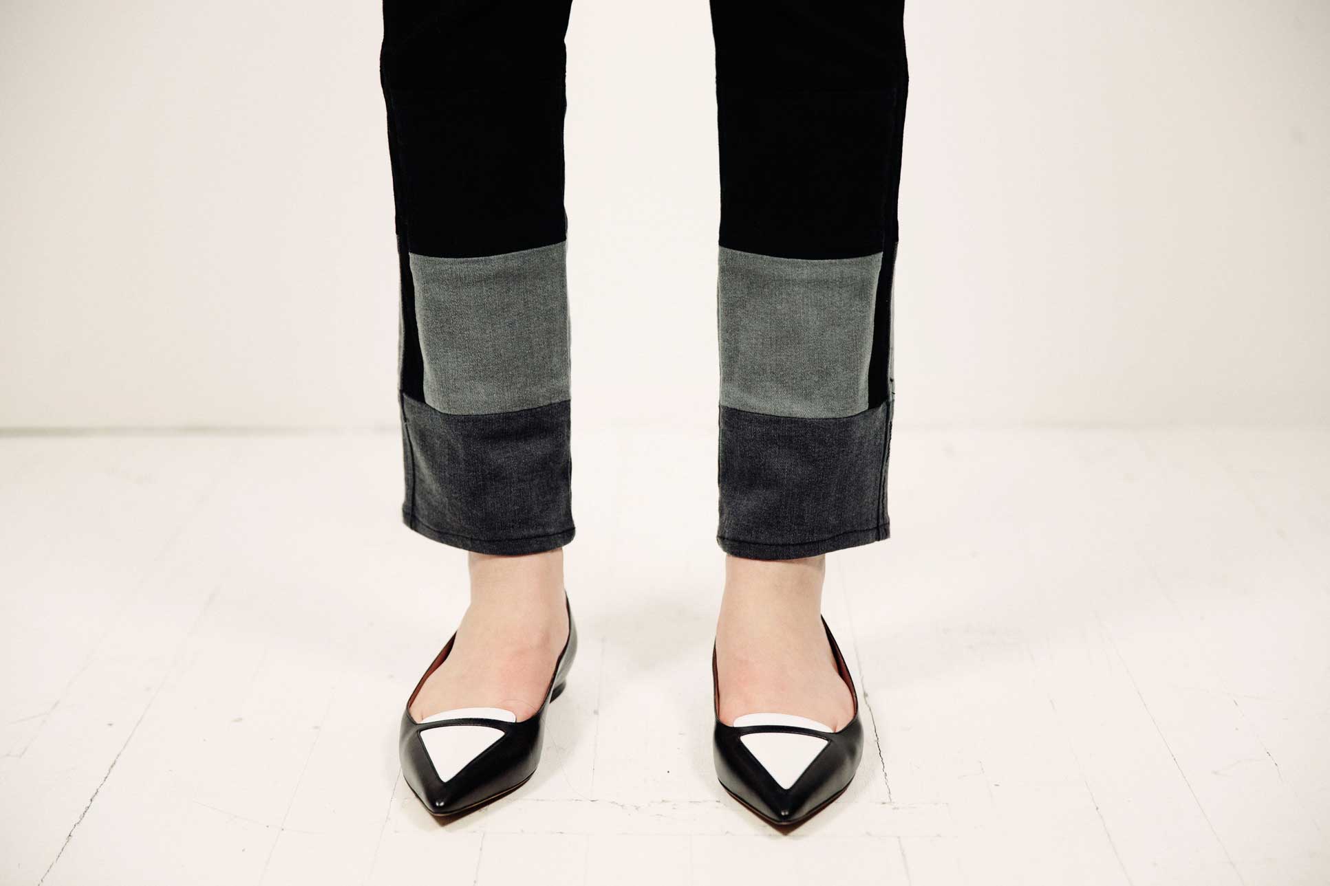 When we walked into the space where Frame Denim was presenting its fall collection this season in New York’s Meatpacking, the lights were down. And the models were all in…black. Black jeans (think coated denim with a velvet tuxedo stripe, faded boyfriends, overalls), black shirts (Frame has added shirts to the line! More on that in a bit), black-and-white Tabitha Simmons Alexa flats and Hayden heels. The Frame guys – Creative Directors Jens Grede and Erik Torstensson, and Design Director Nico Peyrache – had gone to a dark place. But we liked it. We liked it a lot.