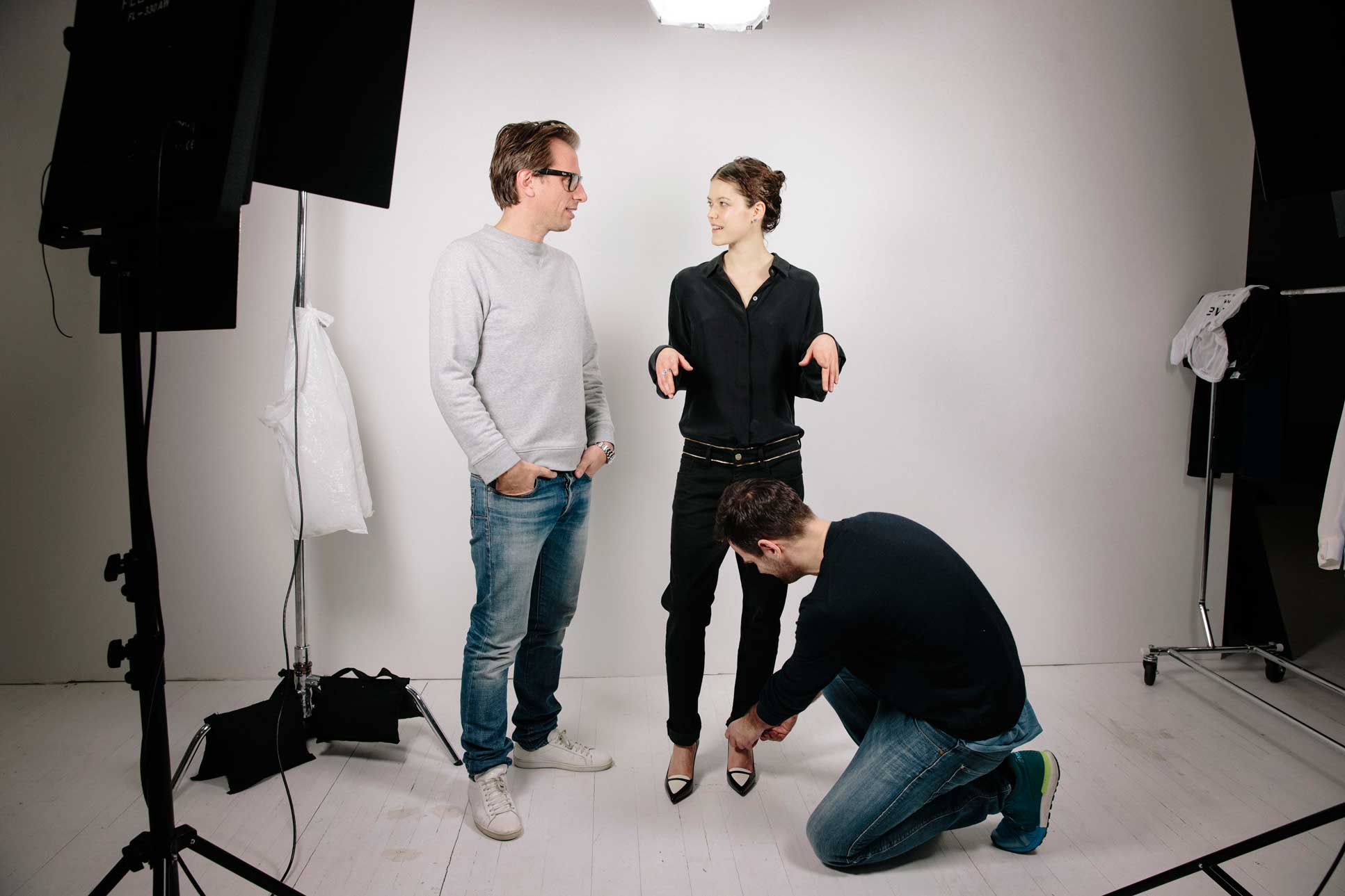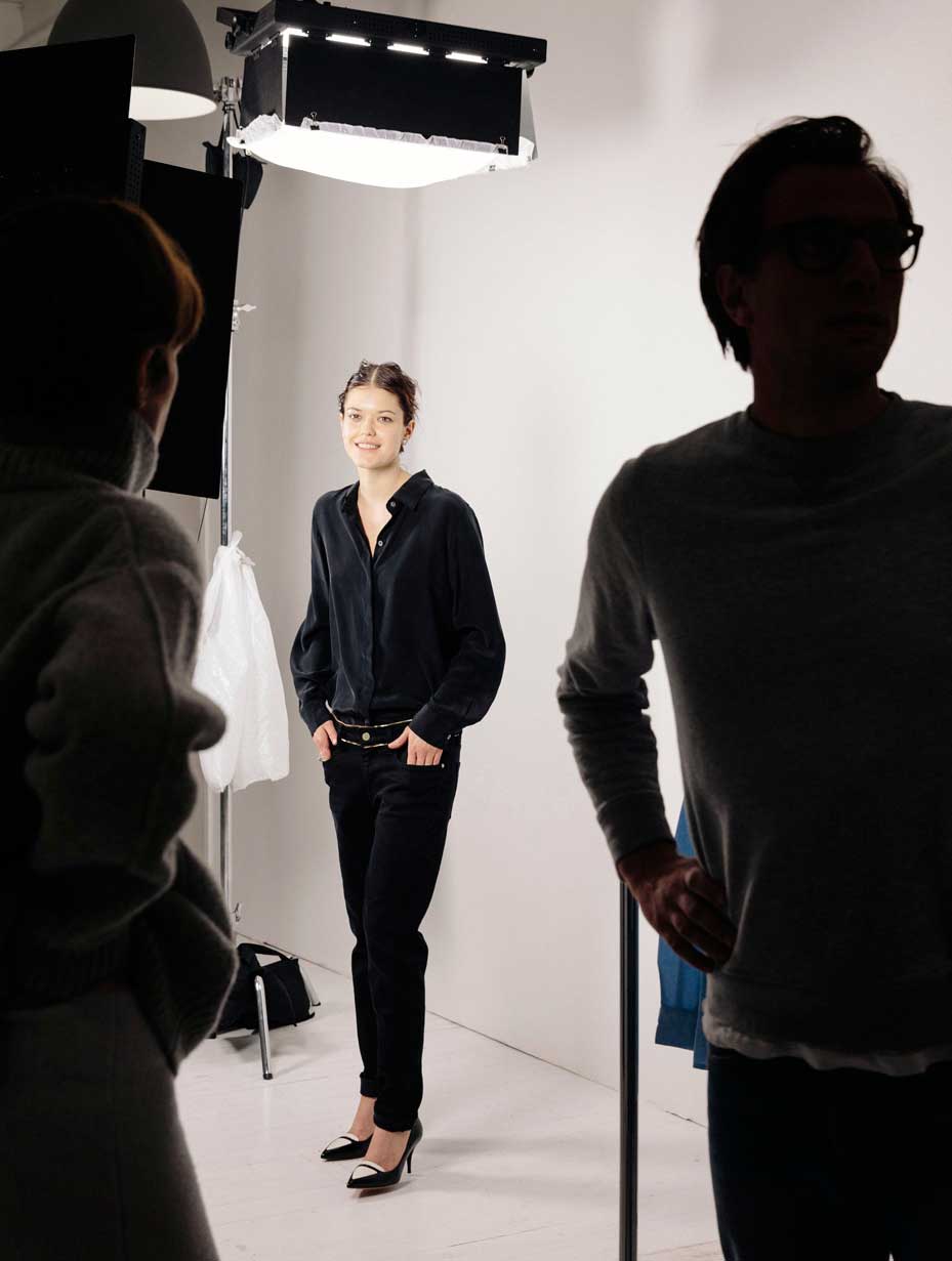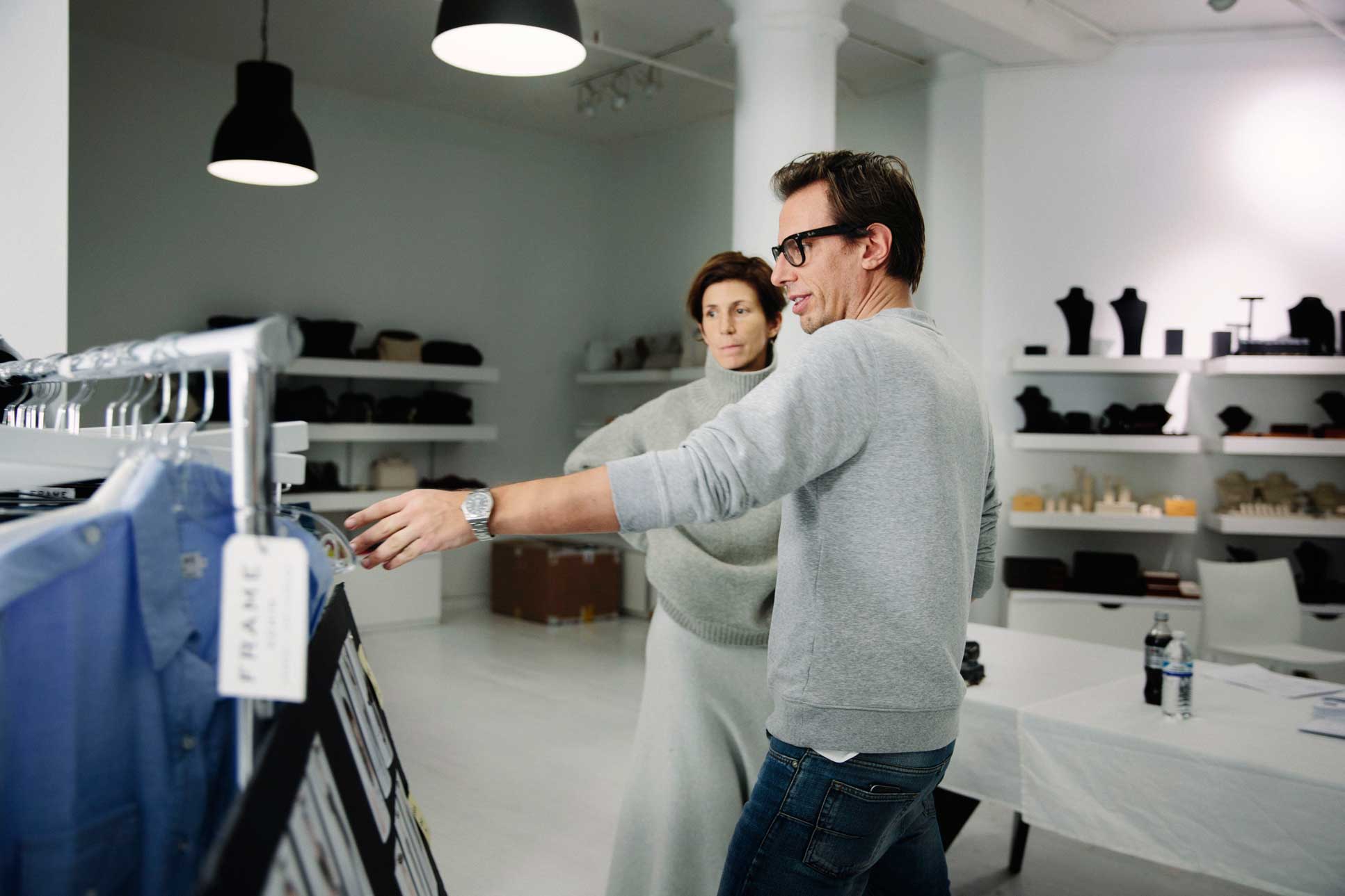 It wasn’t totally a surprise, because they’d very kindly had us over the afternoon before to preview it all during their model fittings with stylist Ludivine Poiblanc (her take on the black jean: “It’s like a uniform.” So true). Right off the bat, they’d told us the theme of the season is “back to black,” – not the song; sorry if it’s stuck in your head now – and not back in a retro way. “Frame is all about the future,” Jens told us. Which is why Frame is moving beyond jeans with a collection of shirts, from a white silk tuxedo top to a blue denim Western style – “more modern, less cowboy,” says Nico – which will no doubt sell out in about, oh, a second once it hits stores.