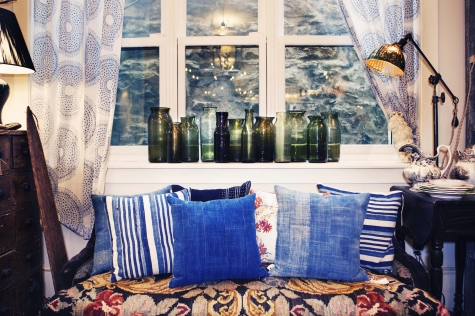 Though part of the furniture collection, which Derian does in collaboration with Cisco Brothers, the loveseat is actually destined to be displayed next door on Dry Goods grounds, in the company of other gorgeous indigo things: sarongs and striped blankets from West Africa; one-of-a-kind pillows flip-sided with an exquisite floral fabric from Tissus Tartares; a pouf made of a vintage laundry sack. “It’s the thing that maybe goes with everything in your home,” says Derian of denim. “As a chair, as a sofa, it doesn’t ever look out of place. Mix it with anything from John Robshaw, and it looks great.”