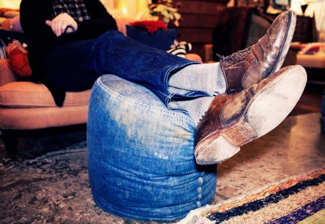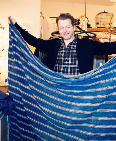“I just think it’s going be incredible when it wears,” says John Derian as he removes the wrapping from a brand-new loveseat upholstered in indigo-dyed denim. “It’ll be so obvious, just like a pair of jeans, or like leather when it patinas.” The denim – made of 55% hemp and 45 % cotton – is one of five new fabrics that Derian is introducing into his furniture line, which is now housed in its own shop in between his decoupage-filled flagship and Dry Goods stores on East 2nd Street in New York City. Covering the loveseat, a formal two-seater with a back shaped like a top lip, the casual, blue jean fabric looks phenomenal. “It’s all washed,” Derian says taking a seat (fear not, his beautiful sofa won’t stain its sitters). “We can really do anything in the store in this fabric, but I think this piece is the most popular.”