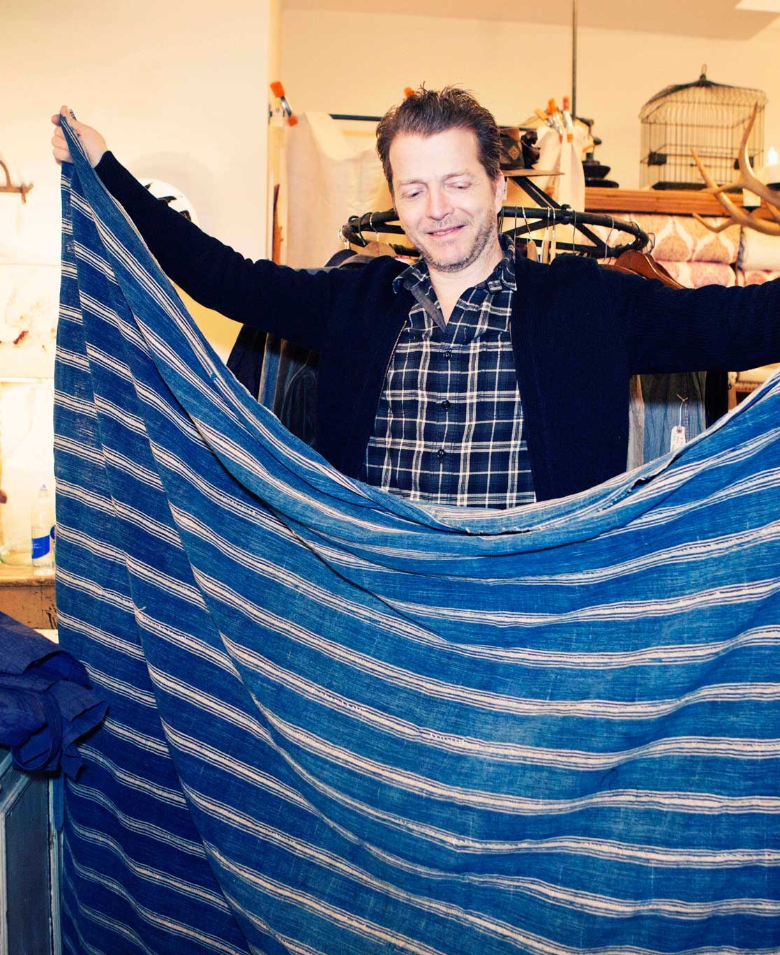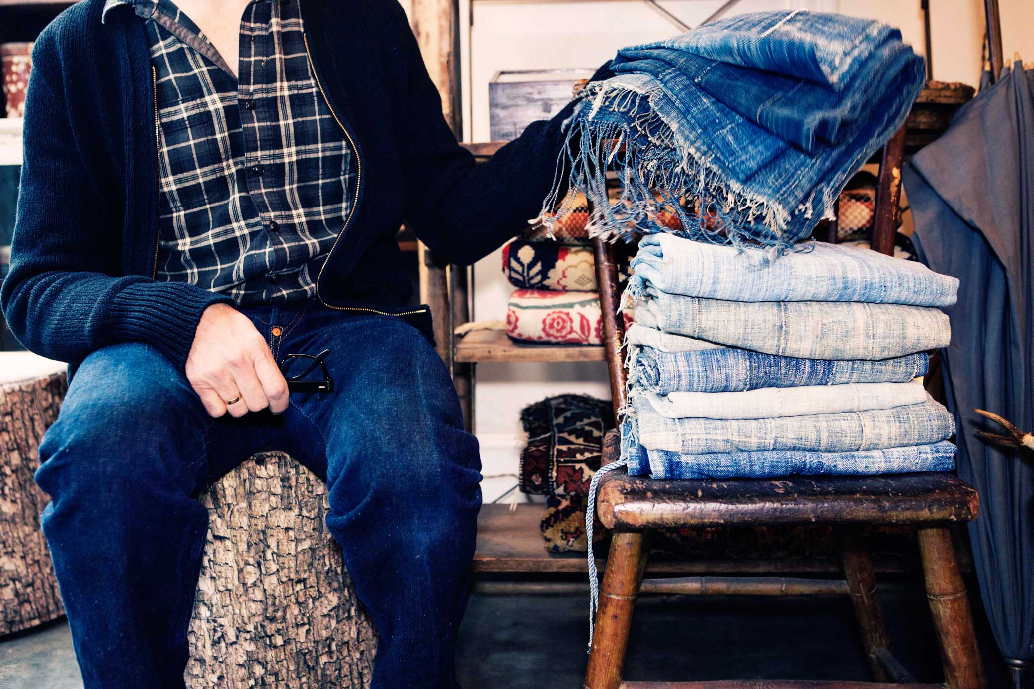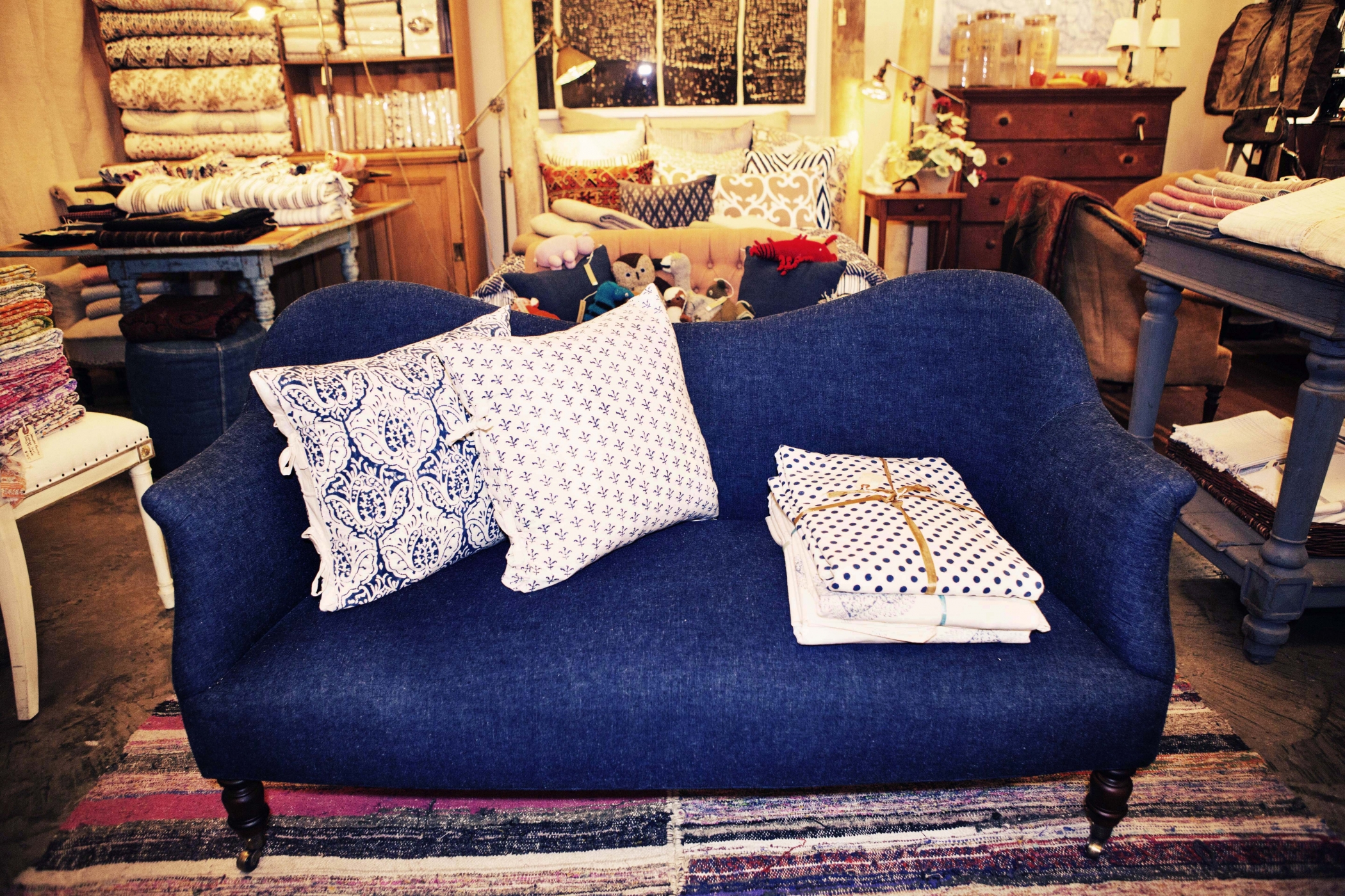 Though part of the furniture collection, which Derian does in collaboration with Cisco Brothers, the loveseat is actually destined to be displayed next door on Dry Goods grounds, in the company of other gorgeous indigo things: sarongs and striped blankets from West Africa; one-of-a-kind pillows flip-sided with an exquisite floral fabric from Tissus Tartares; a pouf made of a vintage laundry sack. “It’s the thing that maybe goes with everything in your home,” says Derian of denim. “As a chair, as a sofa, it doesn’t ever look out of place. Mix it with anything from John Robshaw, and it looks great.”