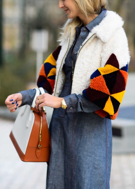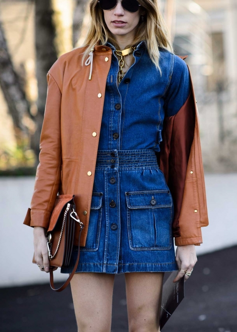 Compared to last season, the fall 2015 collections were definitely denim-lite. Not so on the street, though! In Paris, everyone from Russian entrepreneur Miroslava Duma to French model Jeanne Damas was wearing jeans – and jean jackets, dresses, and skirts. Belted, belled, and bigger than your boyfriend’s…tight, tailored, and trimmed with leather… I spotted the best inspirations for how to wear denim NOW in the front row. It was so much fun! The pieces editors picked to wear came as much from big labels (Chloé, Kenzo, Acne Studios), as they did vintage stores. Women mixed denim with spring’s 70s-heavy handbags and silhouettes; they rocked curvier pairs and patches. Sarah Harris, the fashion features director for British Vogue, wore the Paige Verdugo skinnies she’s been known to love, Style.com’s Rachael Wang had her J Brand x Simone Rocha ruffle-front jacket on, I buttoned-up my favorite AMO Babes, and we all got the job done!