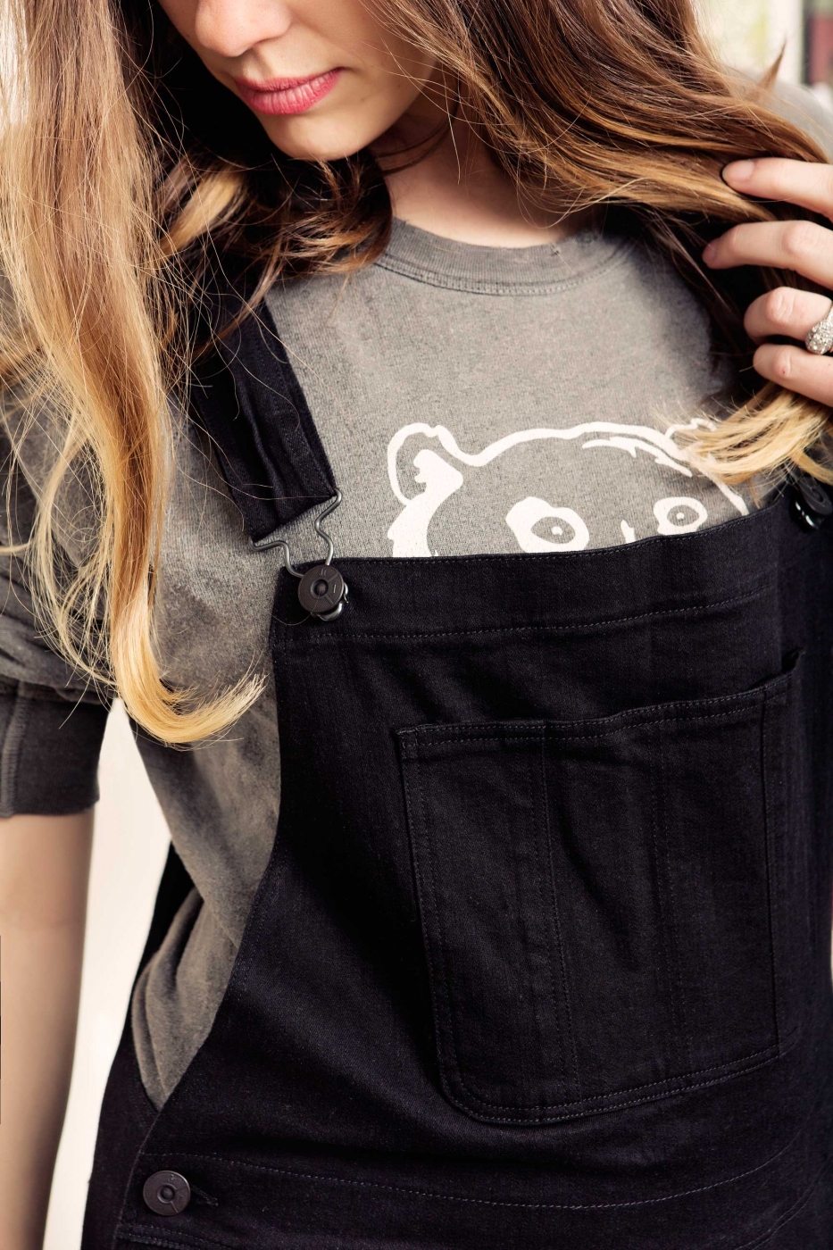 I’m not going to get into whether this all-in-one style of denim is chic, or age-appropriate, or flattering or whatever. Every woman’s gotta decide that for herself. No judgement here. But I’m digging these dungarees because of their deep black hue and their fit. I’m wearing them a bit baggier. (Note: black overalls are wonderful for when you are five months pregnant, as I am here, and nothing fits; sweatshirts are, too! I love this one from The Great.)