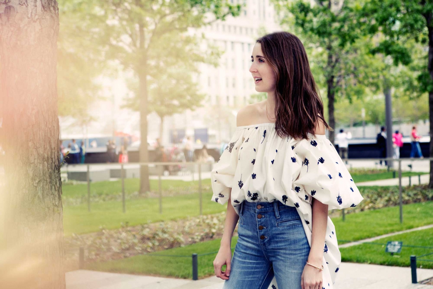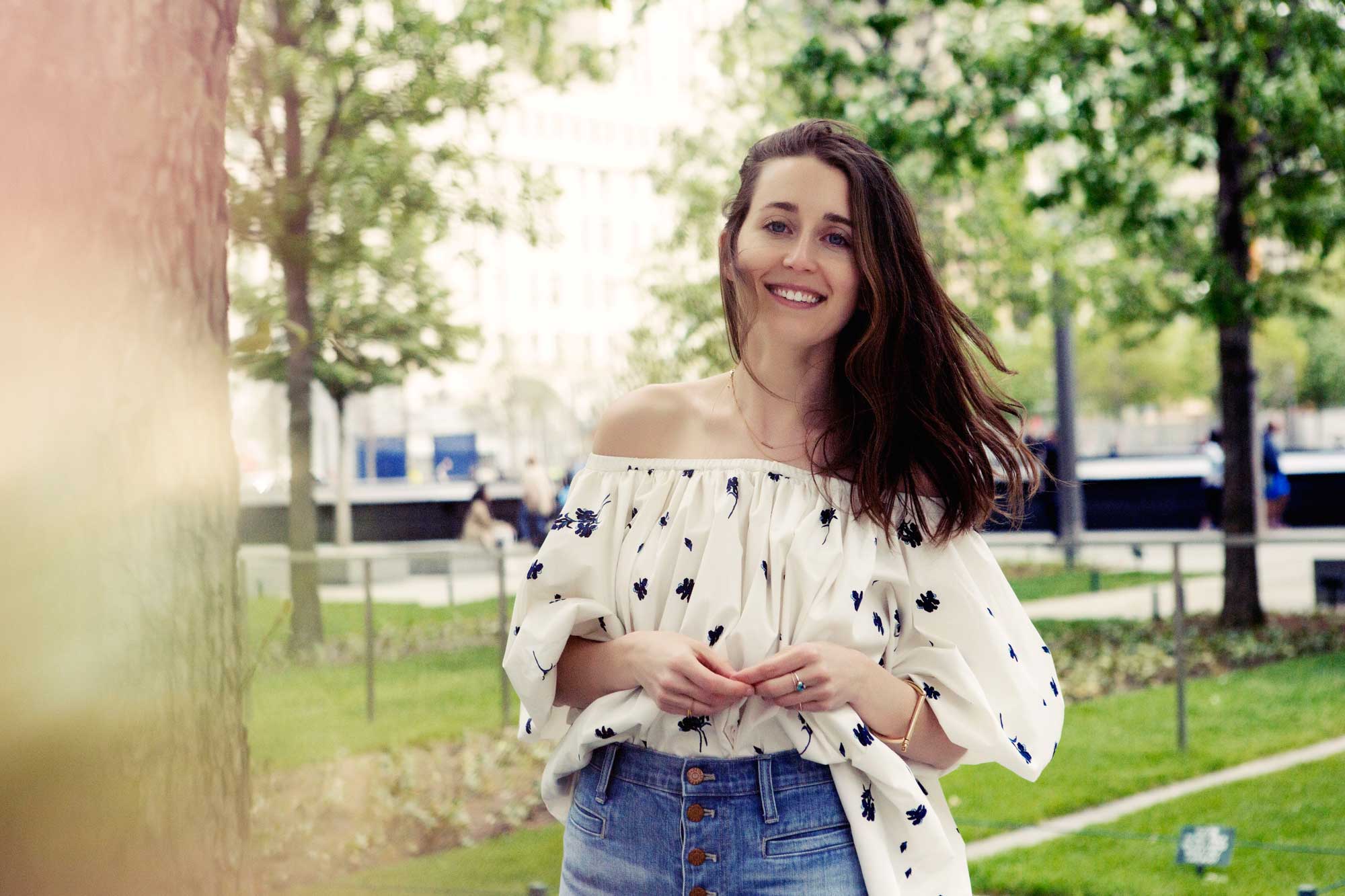 Kudos to Becky Malinsky, Glamour magazine’s senior fashion market editor, for thinking to turn her new Rachel Comey dress into a top by tucking the front of it into a high-rise flare. It’s exactly this – her having not just an eye for great pieces, but also the ability to see their full potential – that makes Becky one of the best in our biz. Her favorite jeans right now: a bell bottom from Madewell called the Flea Market, which has an exposed button fly – “very of the moment,” she says – and a groovy blue wash that she loves because “it looks worn, but it’s not overly whiskered.” Personally, if I was a superhero from the 70s, I’d dress my character just like Becky, in jeans that hide a pair of easy-to-run-in platform shoes and give a girl the power of extra-long legs. WHA-POW!