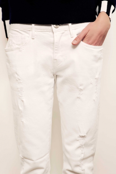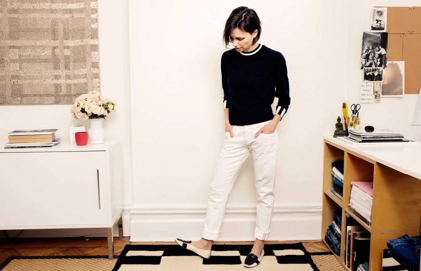 Allow me to introduce our new column, Jean of the Week. It’s just like it sounds – once a week, Florence and I are going try on, test, and tell you all about a style that recently arrived at Jean Stories headquarters (aka my home in Brooklyn), and made us swoon. First up: 3×1’s White Stone Ripper Boyfriend, a relaxed fit with a red selvedge stripe that makes rolling the cuff a must. What I like about this jean: The brightness of the white, which actually makes the walls of our office appear pink (they are not!), and which looks really sharp against a darker sweater (mine is 3.1 Phillip Lim). The rips on the front of these jeans are not holes, so we can wear them in the wintertime, and for a boyfriend they’re not too baggy in the bum, which I like. Remember what Vogue‘s Tonne Goodman taught us about white jeans? It takes just a pop in the wash with a bit of bleach to make them as good as new. Sold!