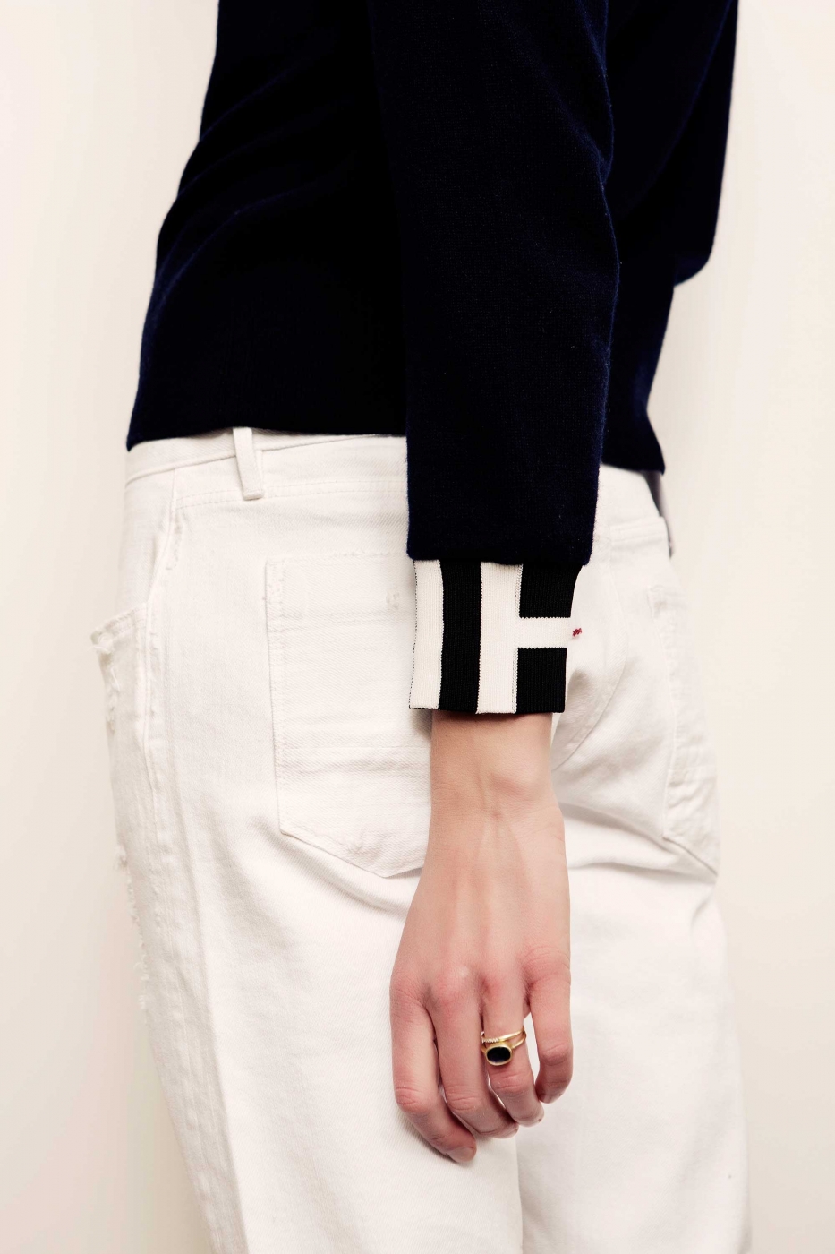 Allow me to introduce our new column, Jean of the Week. It’s just like it sounds – once a week, Florence and I are going try on, test, and tell you all about a style that recently arrived at Jean Stories headquarters (aka my home in Brooklyn), and made us swoon. First up: 3×1’s White Stone Ripper Boyfriend, a relaxed fit with a red selvedge stripe that makes rolling the cuff a must. What I like about this jean: The brightness of the white, which actually makes the walls of our office appear pink (they are not!), and which looks really sharp against a darker sweater (mine is 3.1 Phillip Lim). The rips on the front of these jeans are not holes, so we can wear them in the wintertime, and for a boyfriend they’re not too baggy in the bum, which I like. Remember what Vogue‘s Tonne Goodman taught us about white jeans? It takes just a pop in the wash with a bit of bleach to make them as good as new. Sold!