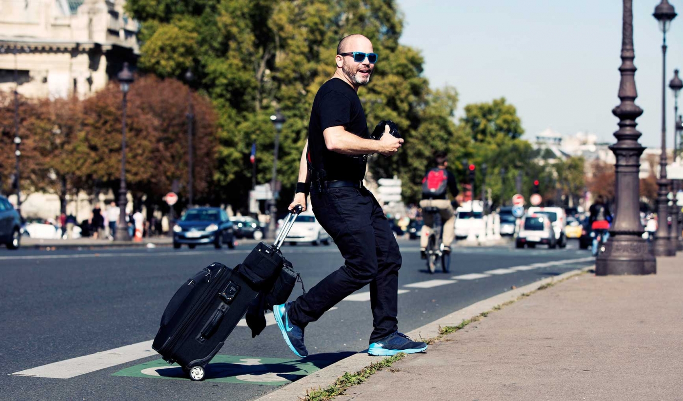 Don’t be fooled by the precious clothes and armies of town cars parked quietly in the background of all those click-friendly street style pics. Fashion week – sorry, month – is work. Hard, pavement-pounding work. And, for those who do all four cities on the circuit (New York, London, Milan, and Paris), it’s also a pretty decent schlep. Kevin Tachman, who shoots backstage and parties for Vogue.com during the women’s seasons, knows this – and needs jeans that a.) look sharp, b.) keep him comfortable, and c.) can take a bit of a beating. If he’s going to wear them to shoot Vogue Italia’s 50th Anniversary party at Piazza Castello, for example, where “it was super hot, crowded, and on three levels,” he told us jokingly (kinda), they really need to be stretchy, lightweight, and durable.