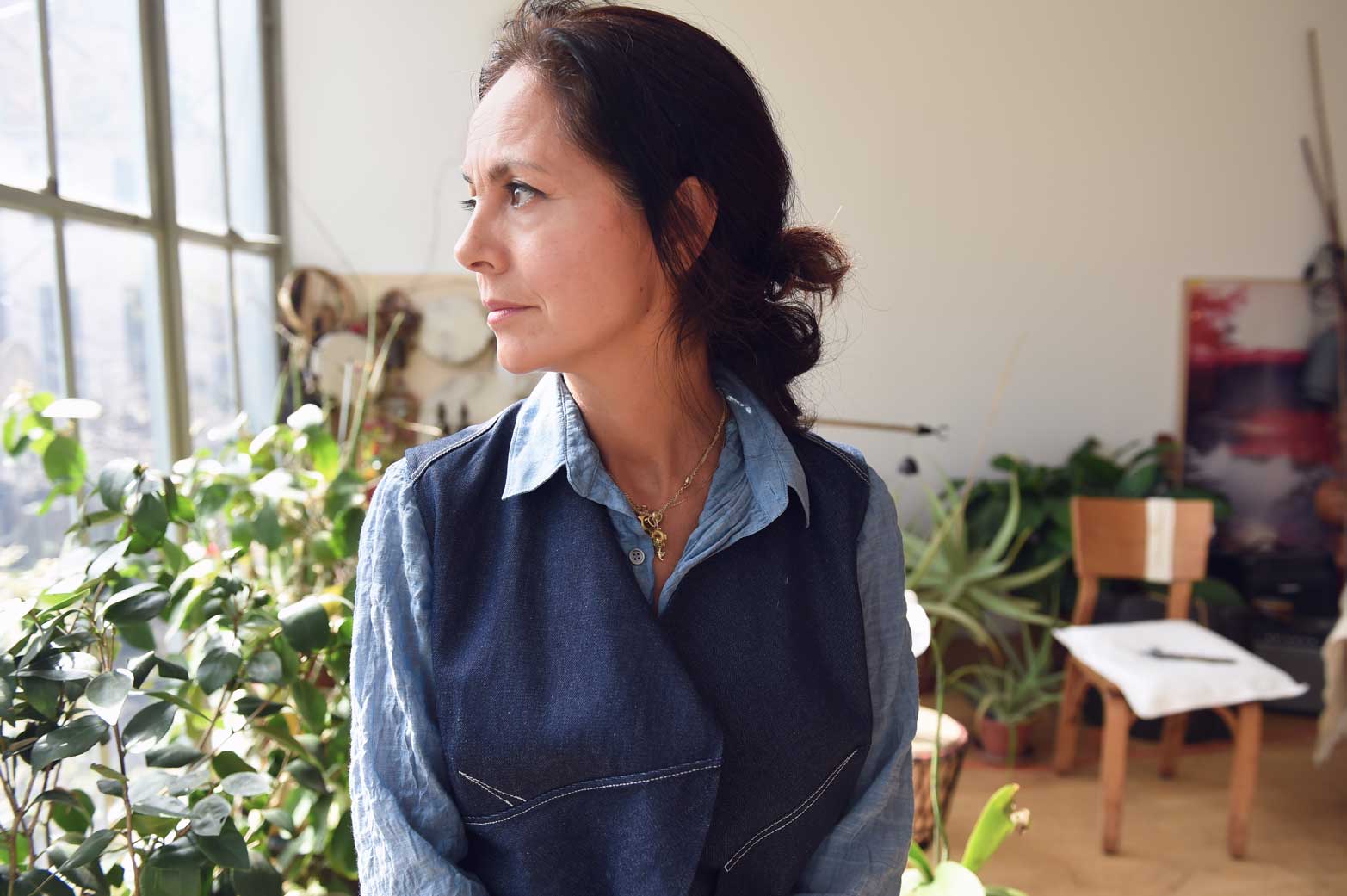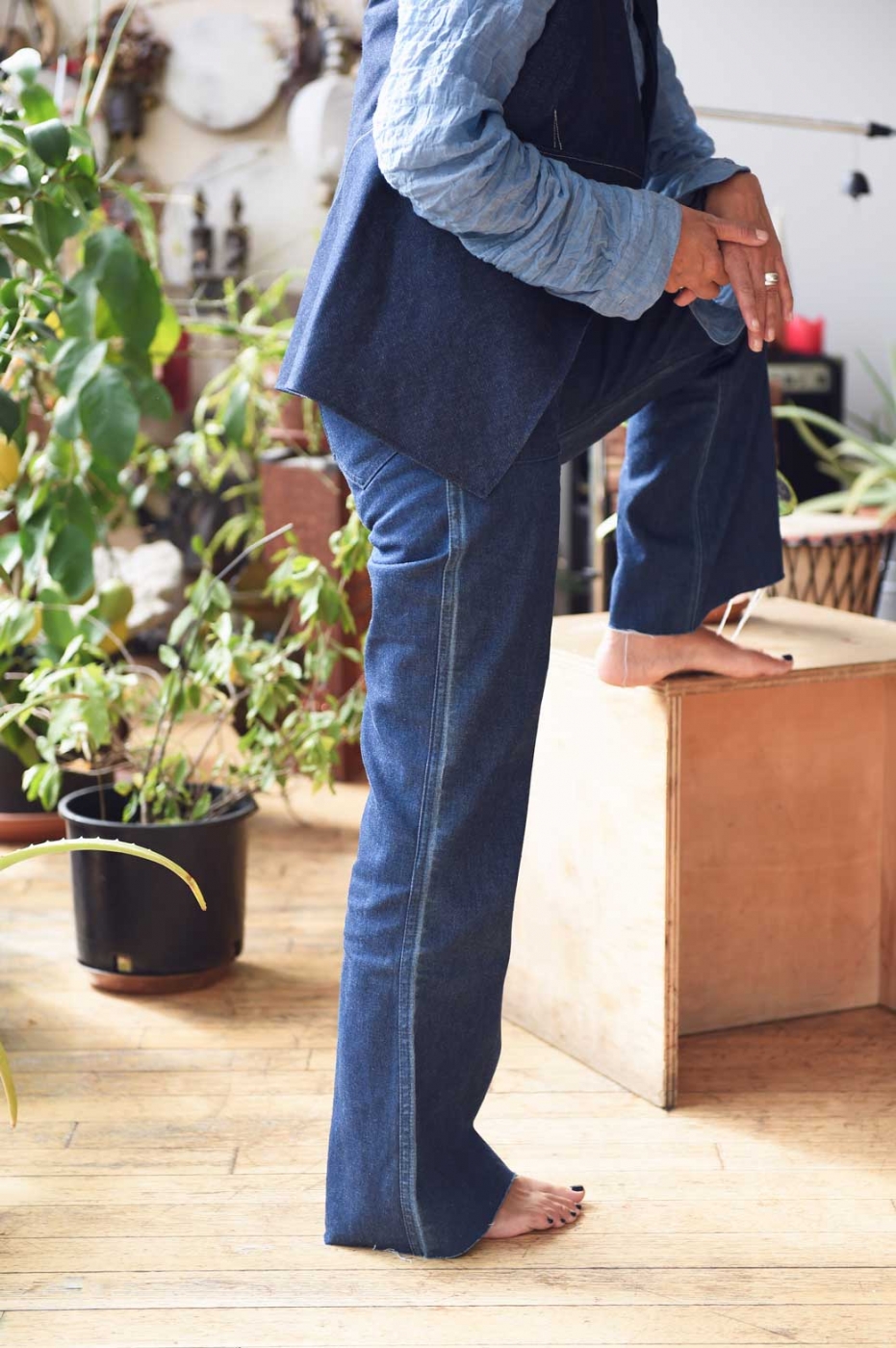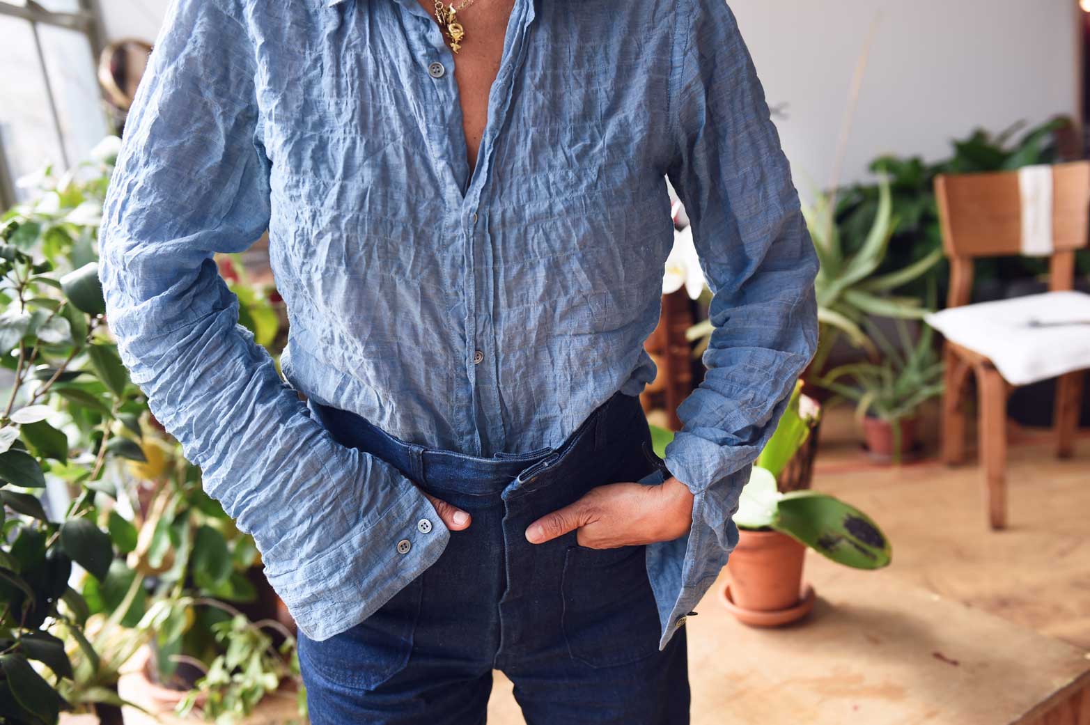 As it turns out, though, not only did Maria once make lots of things in denim and other indigo fabrics – see the waistcoat and men’s shirt she wore for our shoot – she also does have jeans and some great stories, many of which are connected to her daughter, Bibi Cornejo Borthwick. Bibi, a photographer who is launching a non-profit called Tu Sisi in the fall, wears A.P.C.s that once belonged to her dad, photographer Mark Borthwick, every single day. One of many pairs that she inherited – and that Maria used to wear, too – Bibi’s skinny French pedigrees are the opposite of Maria’s $5 sailors. But it’s how these women clash, in the best, most loving way imaginable, that makes their story so revealing and wonderful.
