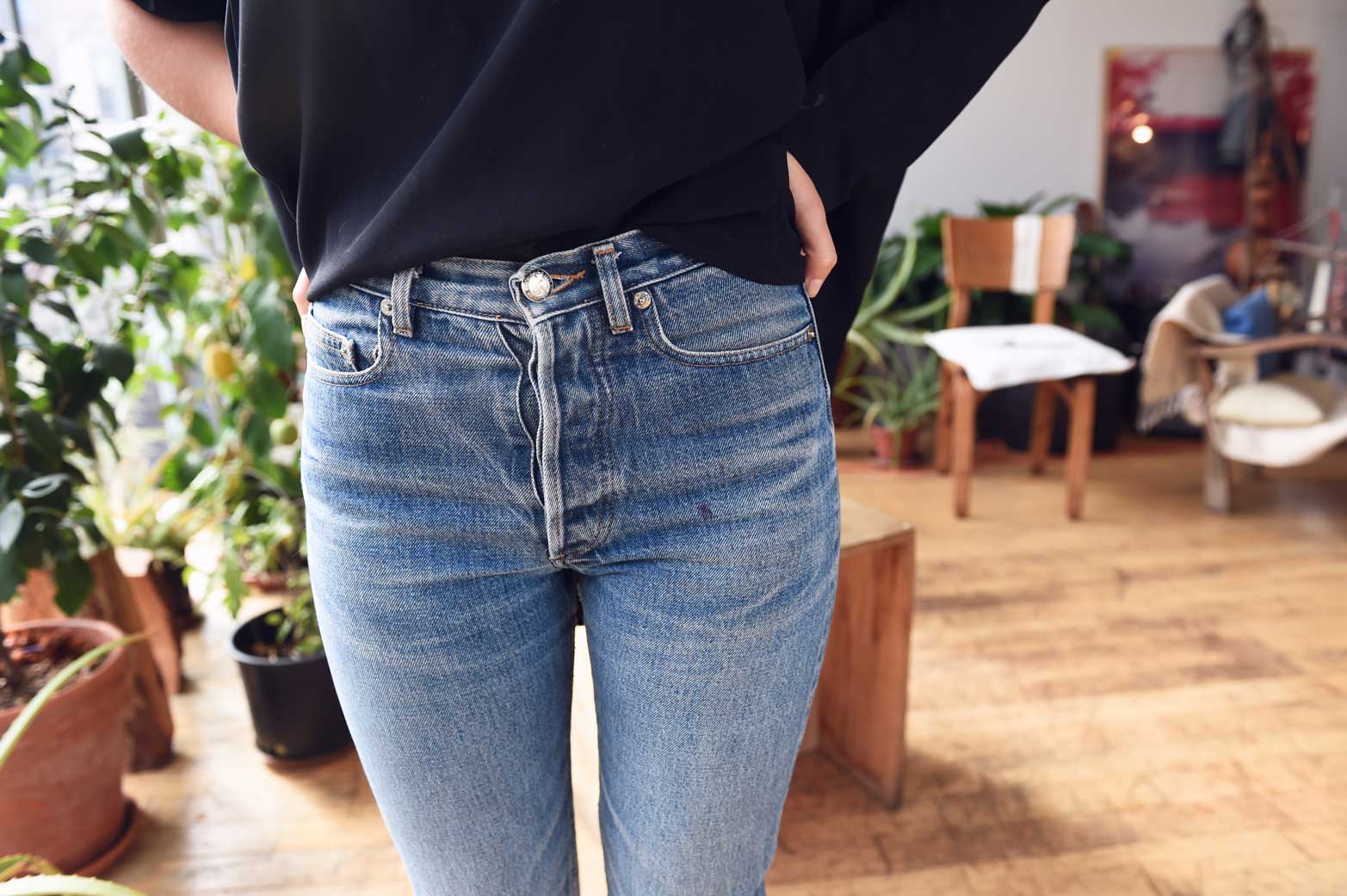 Maria: My jeans I think I got them at a uniform supply store about five years ago for $5. They’re men’s 70s jeans, and I bought them because I like the shape. They’re a little belled. I like the fact that they’re really high-waisted. They were superlong and so I had to cut eight inches off the hem. And I just cut them.