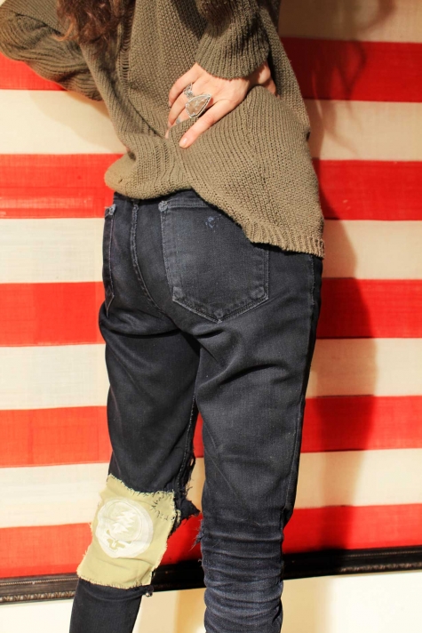 Maybe five years. And once they got one hole, then they really started to go. I’ve repaired the holes five or six times. I even took them to a professional place that does denim repair, but they sort of laughed at me because my jeans were so far gone. They had no way to deal with it. It was going to cost, like, $200! My assistant is a really good seamstress, and so she did some repairs on them for me. And I’ve done some repairs on them myself. And my husband Matthew made me this Grateful Dead patch because I love the Grateful Dead, and so does he. It’s a Steal Your Face skull in army green, which I think is really funny because it kind of looks like a punk patch – like those patches that all the punks sew on to their jackets, for bands like Crass or The Casualities – but mine is for the Grateful Dead. So it’s more of a peaceful patch.