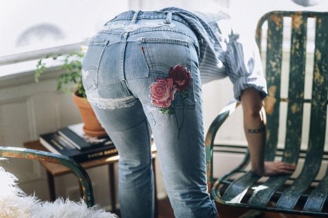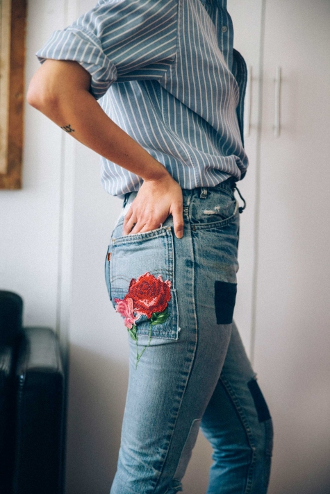 There are approximately six patches on the front of Rachael Wang’s vintage Orange Tab Levi’s, and six on the back. I say approximately because it’s hard to see where some of the ones that overlap each other on the bum begin and end. And do the roses on her back right pocket count? Possibly, if there are holes behind them. “I’ve split the back and the knees too many times to count,” said Rachael, who is Style.com’s fashion market director, when I asked her if she was responsible for all that wear and tear. Well, no. Rachael’s jeans – which might be 606s, we agree, though they’ve lost their back tag, so we’ll never know for sure – came with most of their patches and ladylike decorations. They were found at a Nifty Thrifty warehouse sale and, because they fit her so perfectly, given to Rachael for free. Every Levi’s lover’s vintage karma should be so good.