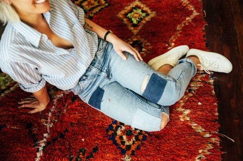 At home in Greenpoint, Brooklyn where she lives with her husband Daniel, Rachael wore her Levi’s with white lace-up Tretorn sneakers and a soft blue-and-white striped button down. “I don’t know what it is, it’s my husband’s,” she said about the shirt. About her apartment, decorated with a colorful mix of things – a hot-pink Roxy surfboard (that she can ride; she’s a Cali girl from Manhattan Beach, btw), a Moroccan rug bought via Etsy, electric guitars (Daniel’s) – Rachael said, “My jeans are totally in their element here. They’re actually a lot like home: quirky, eclectic, casual.”