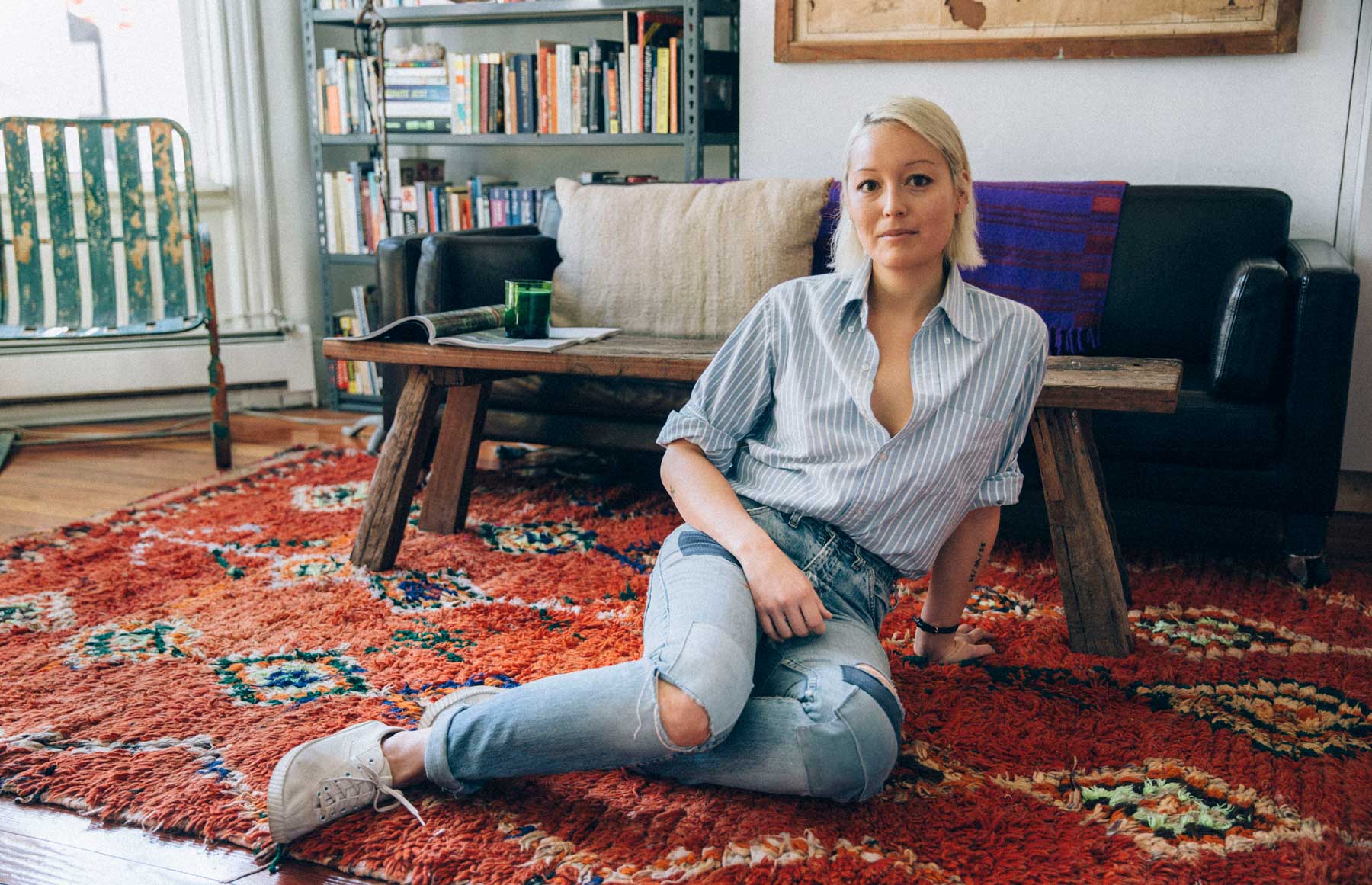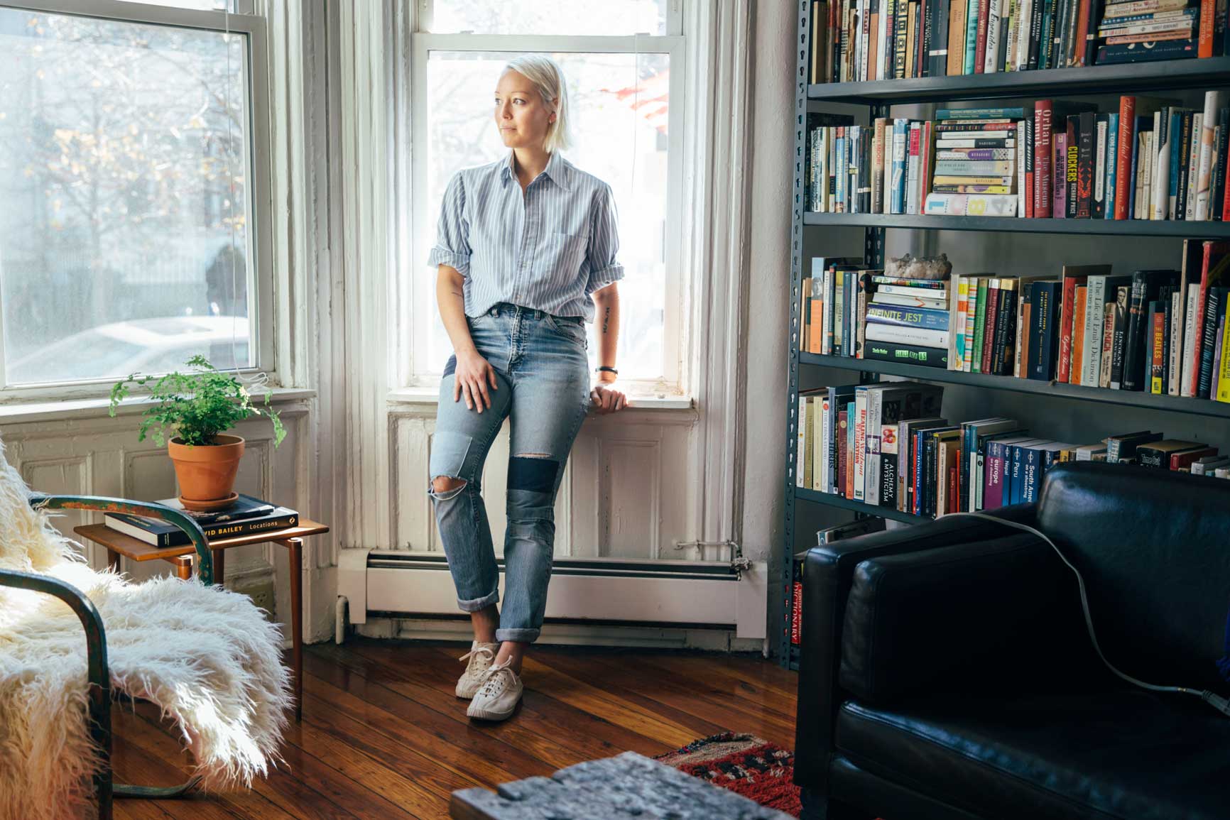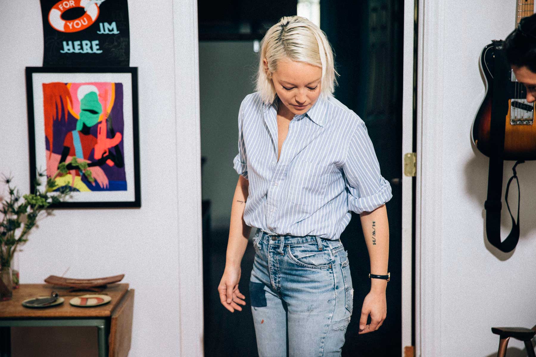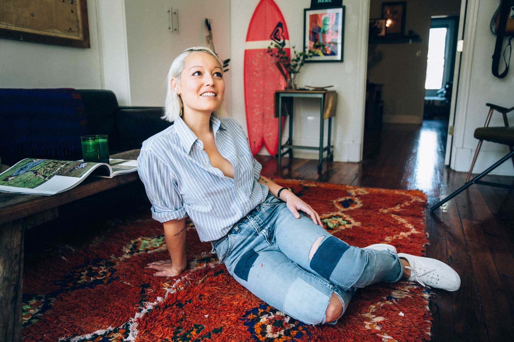 At home in Greenpoint, Brooklyn where she lives with her husband Daniel, Rachael wore her Levi’s with white lace-up Tretorn sneakers and a soft blue-and-white striped button down. “I don’t know what it is, it’s my husband’s,” she said about the shirt. About her apartment, decorated with a colorful mix of things – a hot-pink Roxy surfboard (that she can ride; she’s a Cali girl from Manhattan Beach, btw), a Moroccan rug bought via Etsy, electric guitars (Daniel’s) – Rachael said, “My jeans are totally in their element here. They’re actually a lot like home: quirky, eclectic, casual.”