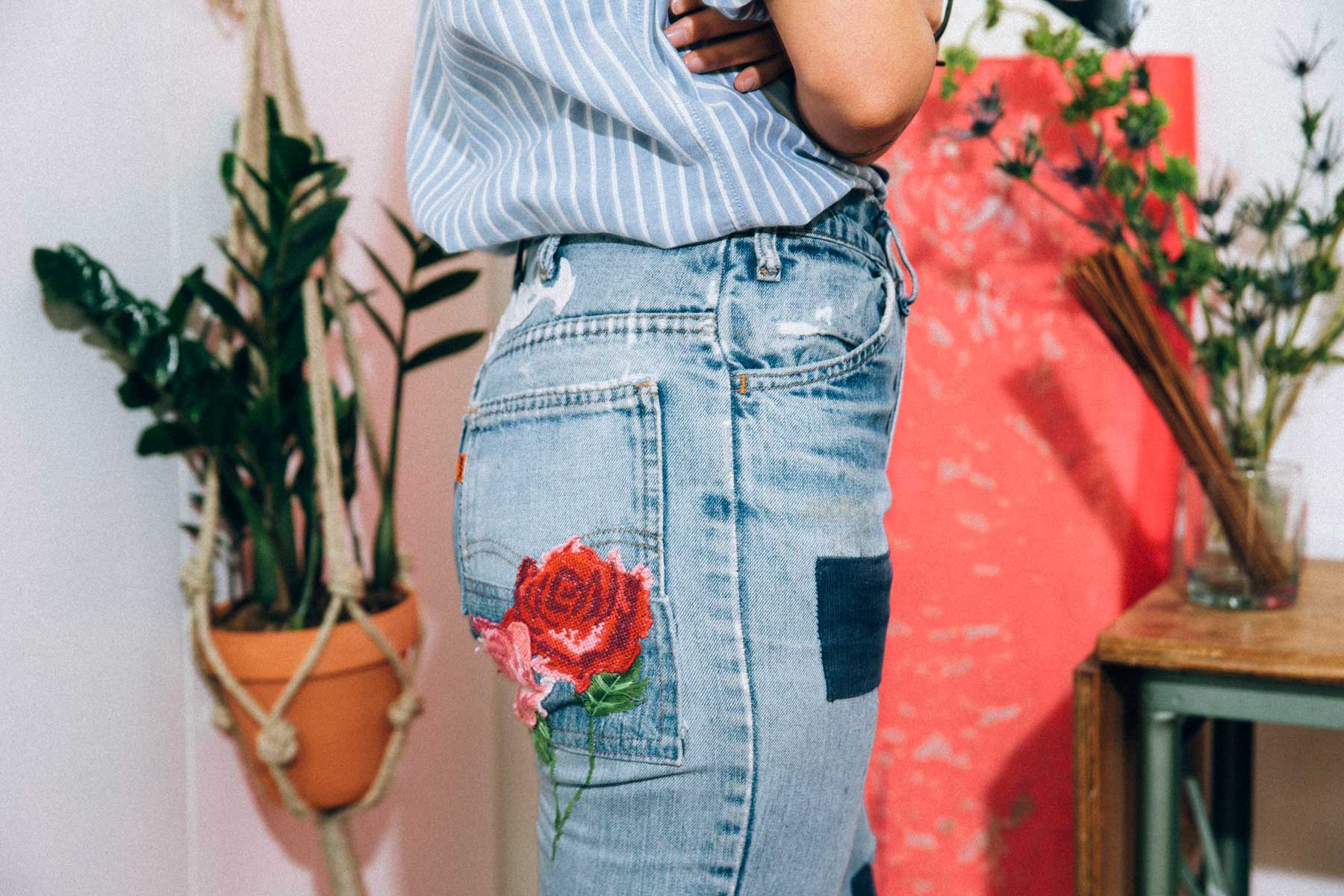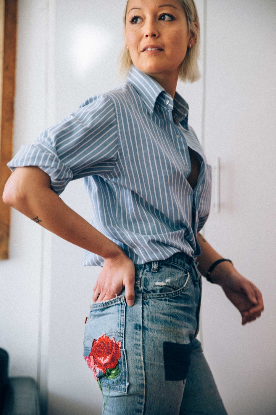 There are approximately six patches on the front of Rachael Wang’s vintage Orange Tab Levi’s, and six on the back. I say approximately because it’s hard to see where some of the ones that overlap each other on the bum begin and end. And do the roses on her back right pocket count? Possibly, if there are holes behind them. “I’ve split the back and the knees too many times to count,” said Rachael, who is Style.com’s fashion market director, when I asked her if she was responsible for all that wear and tear. Well, no. Rachael’s jeans – which might be 606s, we agree, though they’ve lost their back tag, so we’ll never know for sure – came with most of their patches and ladylike decorations. They were found at a Nifty Thrifty warehouse sale and, because they fit her so perfectly, given to Rachael for free. Every Levi’s lover’s vintage karma should be so good.