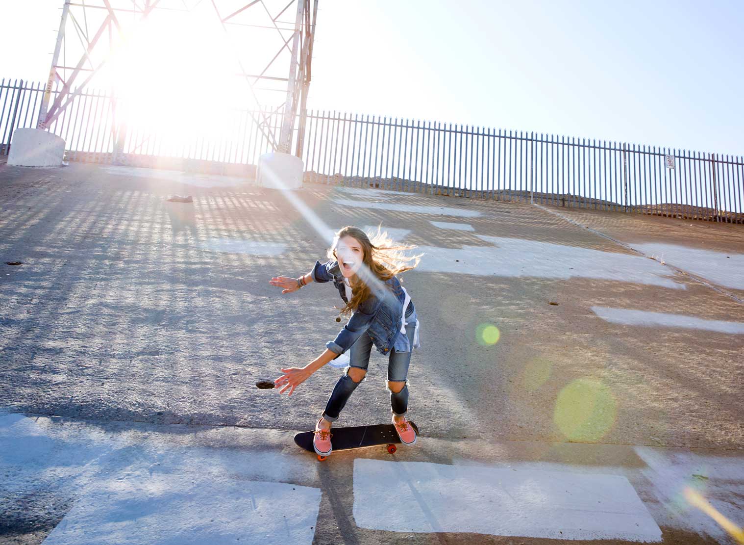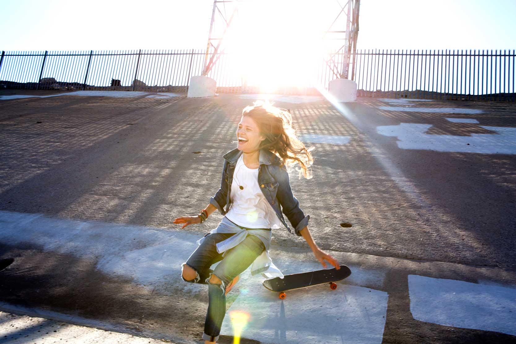 FLY WITH ME Skateboarder and photographer Sierra Prescott skating the L.A. River in Madewell denim.