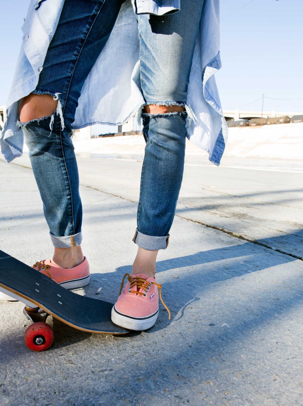 Anytime anyone is described as “super rad,” you gotta check her out. We clicked. Wow, yes. Sierra’s look: slim-cut jeans (with some stretch), a t-shirt, maybe a button-up, and Vans. So very Southern Californian. (She’s a native, after all.) We had to photograph her! And we did – in head-to-toe Madewell skating the L.A. River. Sierra, who lives “on the cusp” of Silverlake, doesn’t skate the cement waterway often; “It’s pretty grungy down there,” she says. She prefers to go by the beach. “Something about being in the birthplace of skateboarding – Southern California – just gives me a rush!” Read on for more about her denim, and more rad pics of her skating.