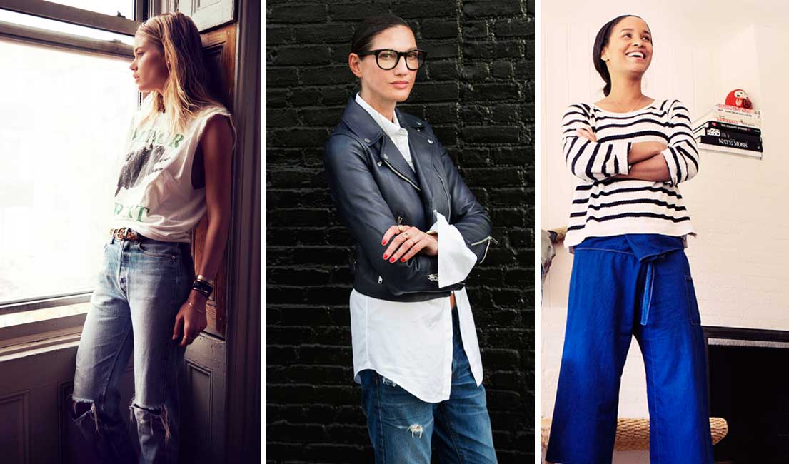 Kaede MatsumotoClockwise from top left: Vogue‘s Kelly Connor in her perfectly broken-in Nudie Tight Long Johns, Jenna Lyons in her favorite J.Crew Point Sur X-Rockers, Rachael Wang in the rose-sewn Orange Tabs she got for free, and Levi’s Kaede Matsumoto in custom tapered and tailored 501s.
