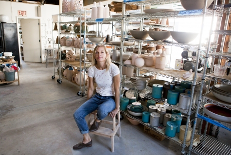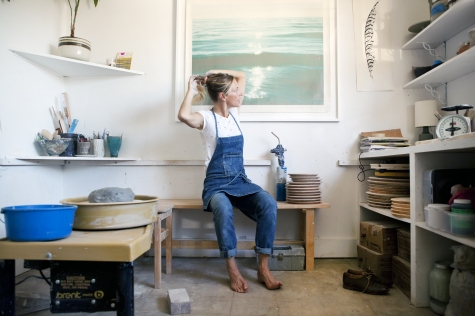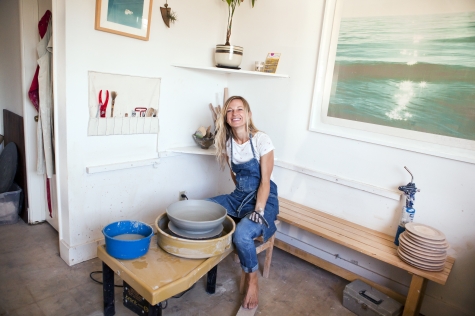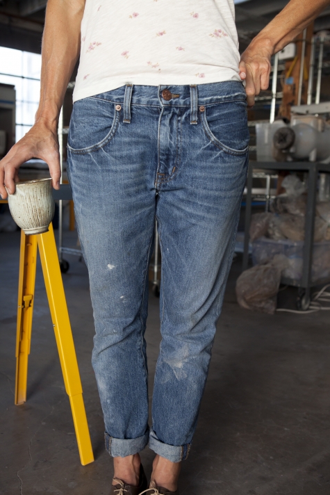 Why? Because when Victoria isn’t throwing porcelain bowls and stoneware table lamps – which she sells at stores like Ok! and Lawson Fenning in Los Angeles, and March and The Future Perfect in San Francisco – she’s building sets for commercials (her other job) and heading out to surf (her other passion). Jeans let her go from one to the next without pause. Or too much maintenance. “The lighter clays all wash out,” she said when I asked her about the risk-factor involved in wearing her favorites at the wheel. About why she loves pottery, she was much less practical, much more emotional in her response: “Because you can feel the hand of the person who made it.”